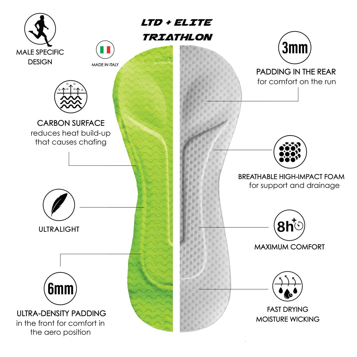 Engineered specifically for triathletes, the PRO CARBON TRI Chamois is designed to provide triathletes with more protection for the long periods time spent in an aerodynamic position. The unique multi-support construction eliminates pressure peaks that occur towards the nose of the saddle due to the low aero tri bike position. This light-weight slim fitting tri pad is also designed to provide maximum freedom of movement to make the pad disappear when swimming and running.