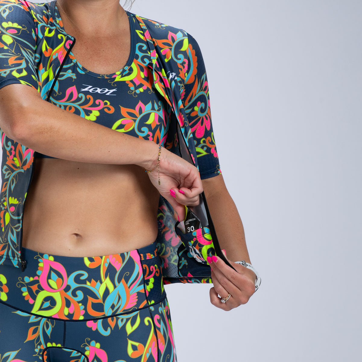 The convenience of a two-piece kit with all the aerodynamic advantages of a one piece, the women's triathlon Aero Jersey is a dynamic powerhouse. Essential nutrition pockets along innovative ice storage pockets make this top race-ready. Long aerodynamic set in sleeves reduce wrinkles to increase speed. The dimpled structure of Vento fabric is placed in critical areas of the garment to reduce the vortex of air, which is generated behind the athlete and, consequently, reducing drag and saving watts. This triathlon Aero Sleeved Jersey promises to deliver on race day!