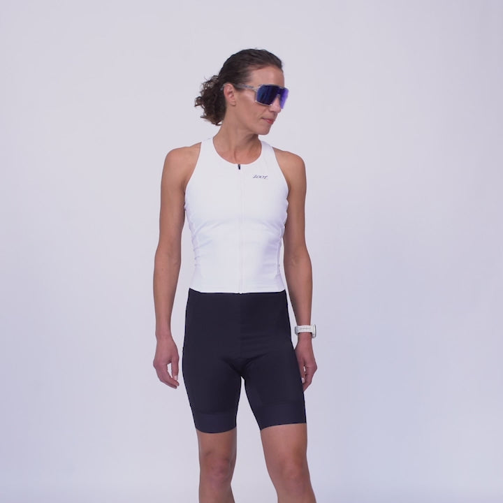 The NEW Core Triathlon Sleeveless Racesuit is designed for triathletes who demand comfort and performance for every mile. Engineered for ultimate comfort, it features a NEW ultra-plush Italian chamois tailored for both racing and training. The full-zip design ensures swift pit stops and precise temperature control during intense efforts. Easy-access pockets securely store nutrition, while the relaxed athletic fit delivers all-day performance. BYOB - Bring Your Own Bra for a customized fit. The Zoot Core Tri Bra pairs perfectly with this Core Sleeveless Racesuit.
