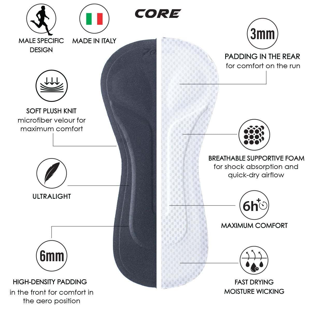 - Plush Italian chamois provides targeted support on the bike, while maintaining sleek comfort through the swim and run
